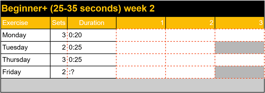 If you are in the zone and want to push your Friday test day to the same day on Thursday you absolutely may do so. Don’t be surprised if you are hanging well past a minute by the end of the second week. As mentioned above, linear progression only works for 2-3 weeks in my experience. So you may need to vary the exercise or take a complete rest week to reset the stimulus. After 3-4 weeks take a week break and repeat if you would like.