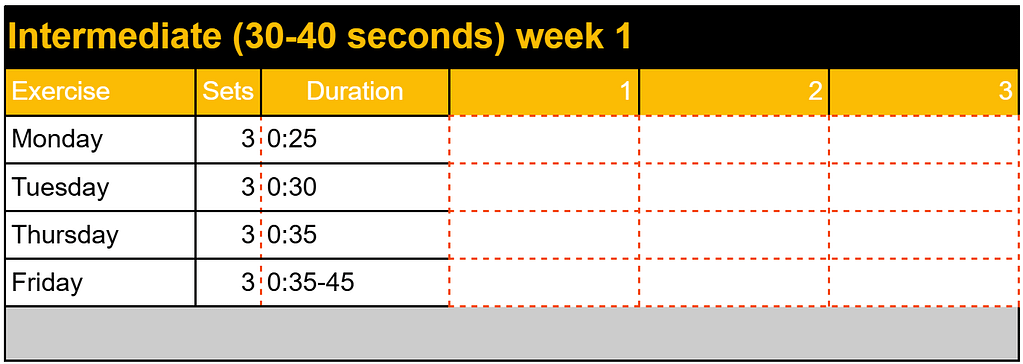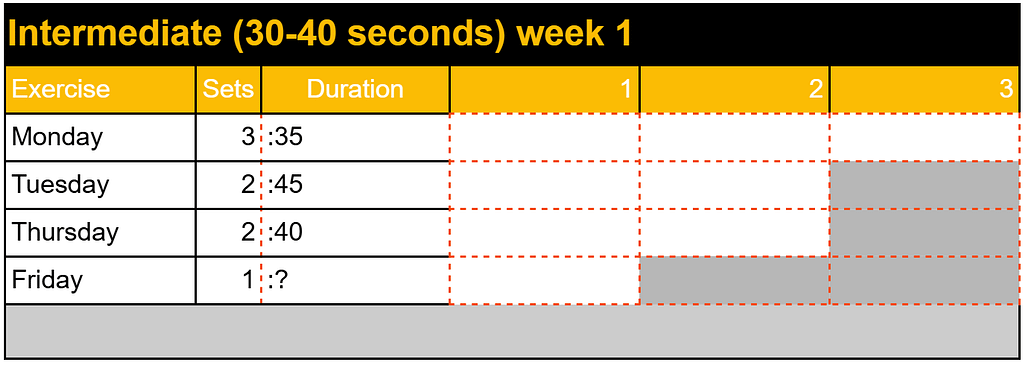 Intermediate level trainees will have a similar plan but will require a little more volume to be able to make progress. If you tested at about 30 – 40 seconds on the dead hang, follow this training plan. Check the boxes as you complete the sets