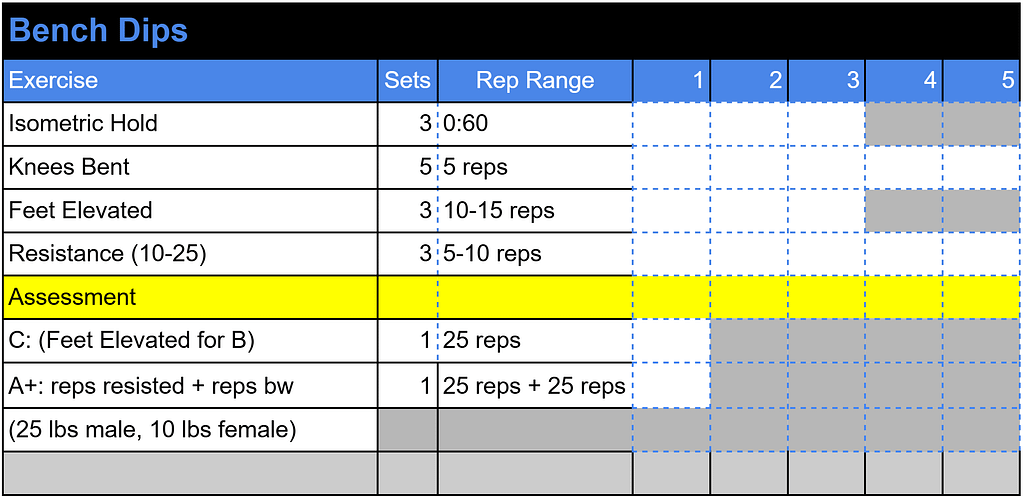 B grade: 25 body weight bench dips with feet elevated to 12-20 inches off ground.